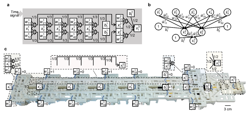 图2.可重编程机械二值化神经网络:(a)示意图;(b)对应的二值化神经网络;(c)实物图