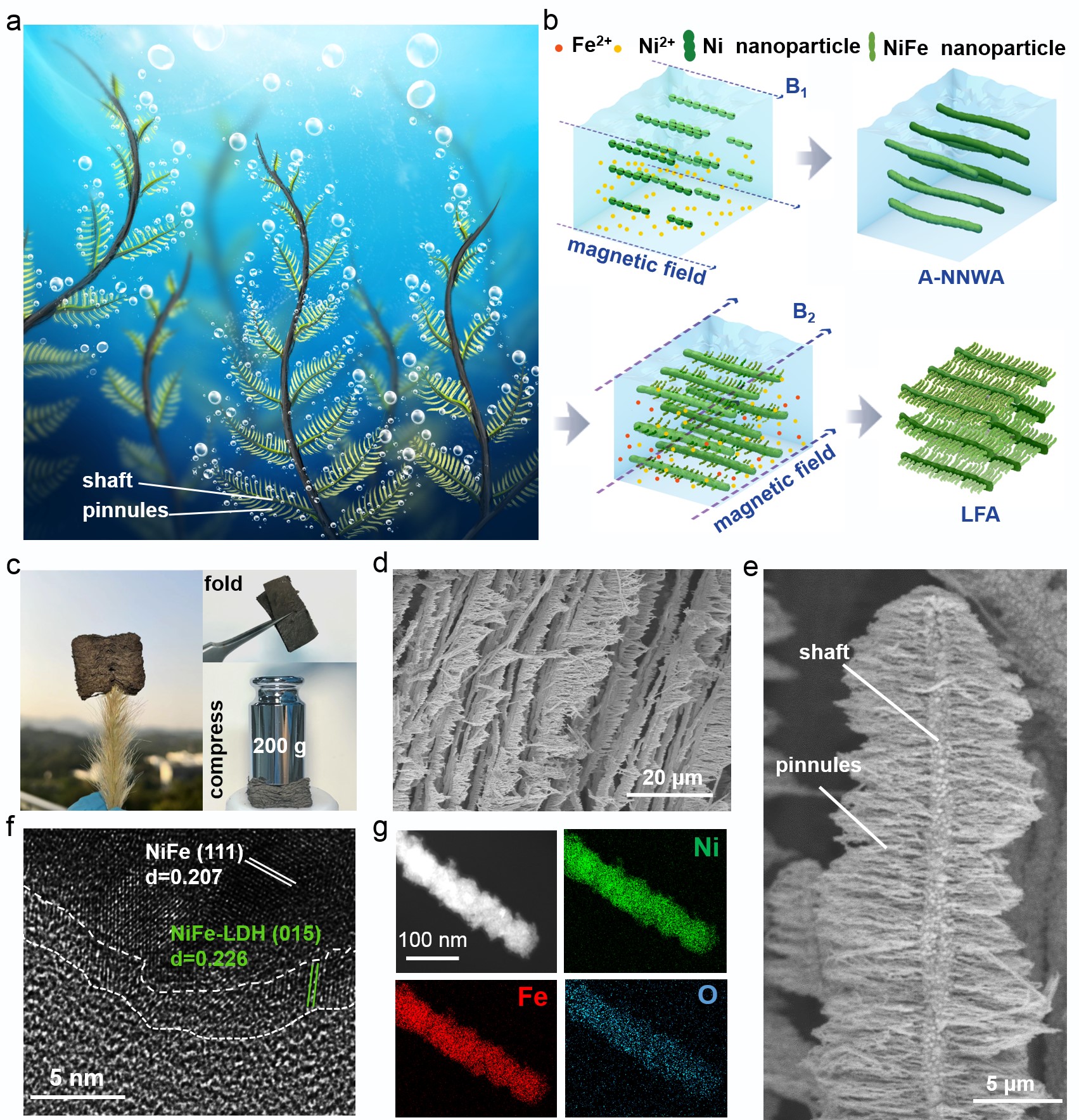 蕨类植物通常具有坚固刚性的轴和丰富且相对柔软的羽片,可以通过弹性变形提供定向应力释放,避免应力集中。研究利用磁场诱导合成方法成功制备了具有设计的“轴”和“羽片”结构的蕨类结构形态的LFA。值得注意的是,较厚的Ni纳米线(NWs)作为“轴”骨架,提供了优异的导电性和机械性能。