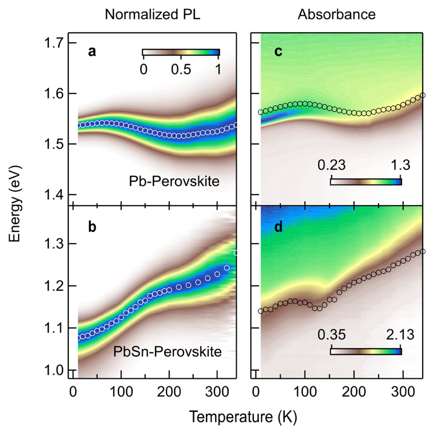 该研究通过溶液旋涂法制备了高质量的钙钛矿薄膜,用荧光光谱(PL)和吸收谱,观测其带隙随温度的变化行为(图1)。可以看到,两种样品的带隙随温度的变化趋势和变化范围都明显不同。与传统半导体(如Si、GaAs)相比,钙钛矿的带隙随温度的变化趋势是相反的,且变化范围很大。