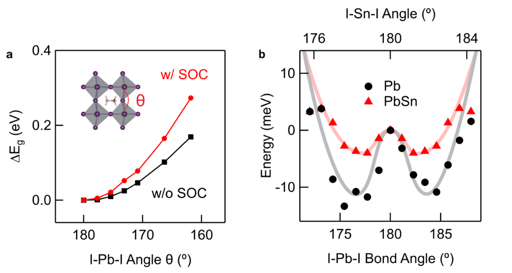 在钙钛矿半导体中,[PbI6]4-/[SnI6]4-在三维空间形成角共享的八面体框架。由于钙钛矿结构的软晶格性质,晶格很容易发生畸变。即便样品在低温下保持着长程的立方结构,晶格仍然会在局域的尺度发生畸变。该研究中第一性原理计算的结果表明,晶格畸变会造成带隙的明显增加,且势能曲线随畸变角度呈现对称的双势阱行为(图2),因此在低温下体系更倾向于处在能量更低的畸变状态。随着温度的升高,体系逐渐由畸变的立方结构变为严格的立方结构,这种变化过程会造成体系带隙的减小。另一方面,随着温度的增加,晶格振荡(动态畸变)变大,造成带隙的增加。因而,钙钛矿体系的带隙随温度的变化可以解释为静态和动态畸变的共同影响。由于纯铅样品的势阱深度和畸变角度都比铅锡样品大,因此静态畸变对纯铅样品的影响更大,静态畸变和动态畸变的竞争显现出图1所示的非单调行为。而铅锡样品由于势阱较浅,带隙变化则主要表现为动态畸变所致的带隙增加。