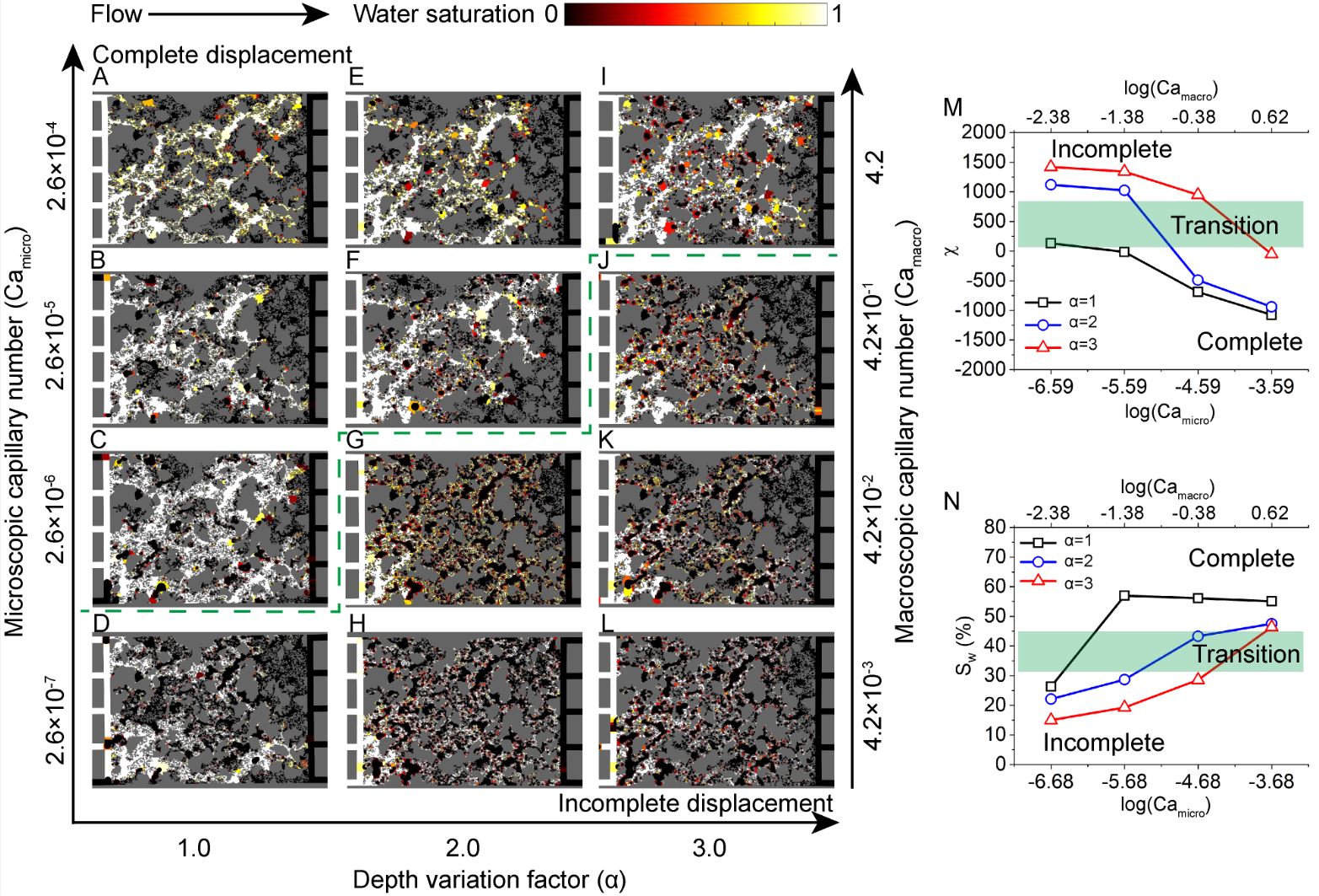图2.毛管数-深度变化因子(Ca-α)空间中的渗吸相图。(A-L)具有不同深度变化因子和宏微观毛管数的微流控芯片的吸入模式,其中过渡部分对应于三深度微流控芯片的宏观毛管数为0时的欧拉数,在这种情况下因为没有深度约束或深度约束很弱,其流体界面的稳定性和不稳定性仅取决于毛管数。据此欧拉数,我们可以在该相图上得到绿色临界线。(M)欧拉数和(N)渗吸过程的润湿流体饱和度与突破阶段毛管数和深度变化因子的函数关系。这些模式对应于当润湿相到达微流控芯片的缓冲层时实验的突破阶段。彩色图显示了侵入水的孔隙平均饱和度