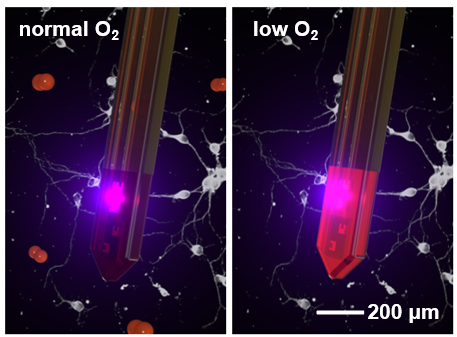 大脑是对氧气最敏感的器官,脑组织中的氧含量直接影响大脑代谢和功能完整性,氧代谢异常也与颅脑创伤、缺血缺氧性脑病、癫痫、肿瘤等引起的神经系统病损密切相关。与近红外光谱、功能磁共振等技术所获得的血氧信息相比,组织氧分压与局部神经活动和代谢过程有着更加密切的联系。如何实时、准确、便捷、原位地监测脑组织氧分压,并解析其与神经活动的相互作用关系,是脑科学基础研究和脑疾病临床诊疗中的关键问题。近日,乐动平台电子工程系盛兴课题组与合作者开发了一种植入式微型光电探针,可在自由活动的动物深层脑组织中实现无线、连续、实时的脑组织氧分压监测。