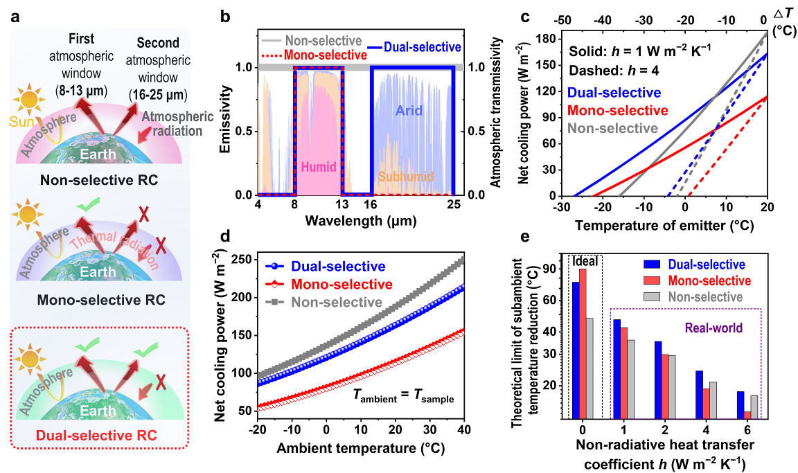 基于此,张如范课题组提出了一种双选择型辐射制冷模型。该模型在两个大气透明窗口波段(8–13μm和16–25μm)均具有高选择性发射率(因此也称为双选择热发射体模型),而在剩余的非窗口中红外波段和太阳光波段均具有很高的反射率(图1a,b)。理论计算表明,这种双选择热发射体模型在干旱的环境中,具有明显优于现有典型辐射制冷设计(非选择型non-selective和单选择型mono-selective热发射体)的亚环境制冷性能(图1c-e)。