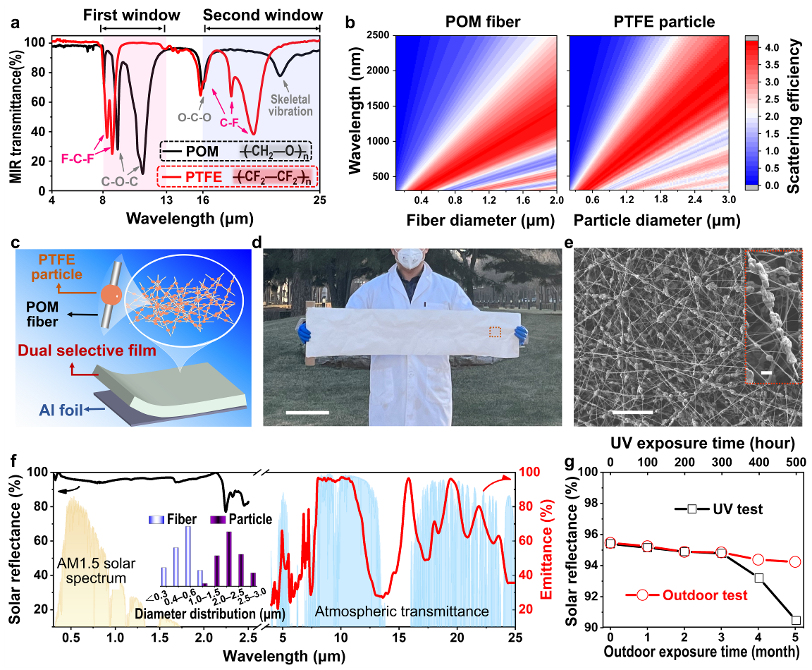 基于上述模型,作者根据分子振动理论(分子级设计)和米氏散射理论(纳/微米设计),首次设计并制备了一种基于聚合物薄膜-金属的双选择热发射体(图2)。首先,作者根据分子振动理论,证明聚甲醛的C-O-C键和聚四氟乙烯的C-F键被选择分别贡献了第一和第二大气透明窗口的高选择性发射率(图2a)。此外,作者根据米氏散射理论,设计了与太阳光波段波长相近的纳米尺寸的聚甲醛纳米纤维和微米分布的聚四氟乙烯纳米颗粒,旨在实现太阳光波段高的米氏散射效率(即高的太阳反射率,图2b)。此外,具有高热反射率的金属基底(本工作采用的是铝箔)使得该材料在非窗口中红外波段具有高反射率,也有助于太阳反射率的提高。