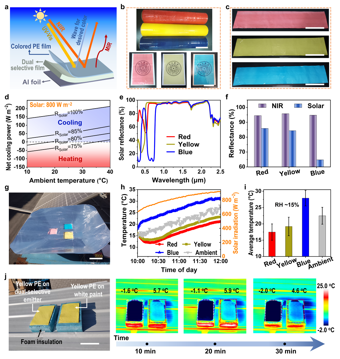 此外,当在双选择热发射体样品表明覆盖不同颜色的彩色PE膜后,样品仍体现出很高的亚环境制冷性能(如红色和黄色),且明显优于彩色化后的商业涂料(图5)。表明双选择材料还具有很高的彩色兼容性,有助于促进辐射制冷材料的大规模实际应用。