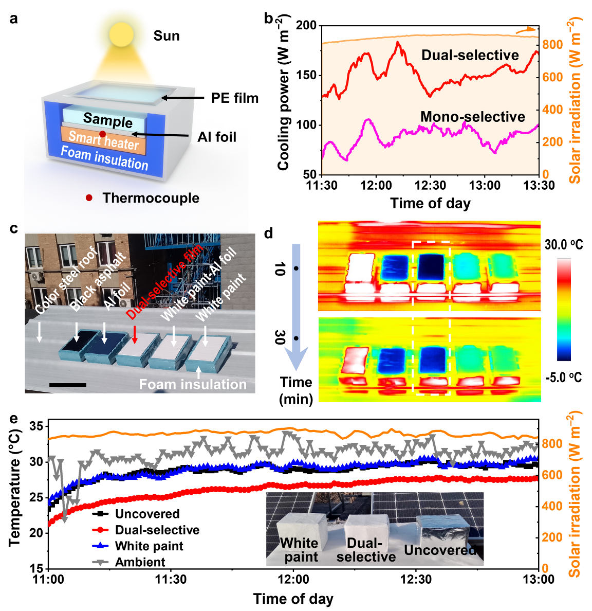 图3. 双选择辐射制冷热发射体在沙漠环境下的制冷性能测试
