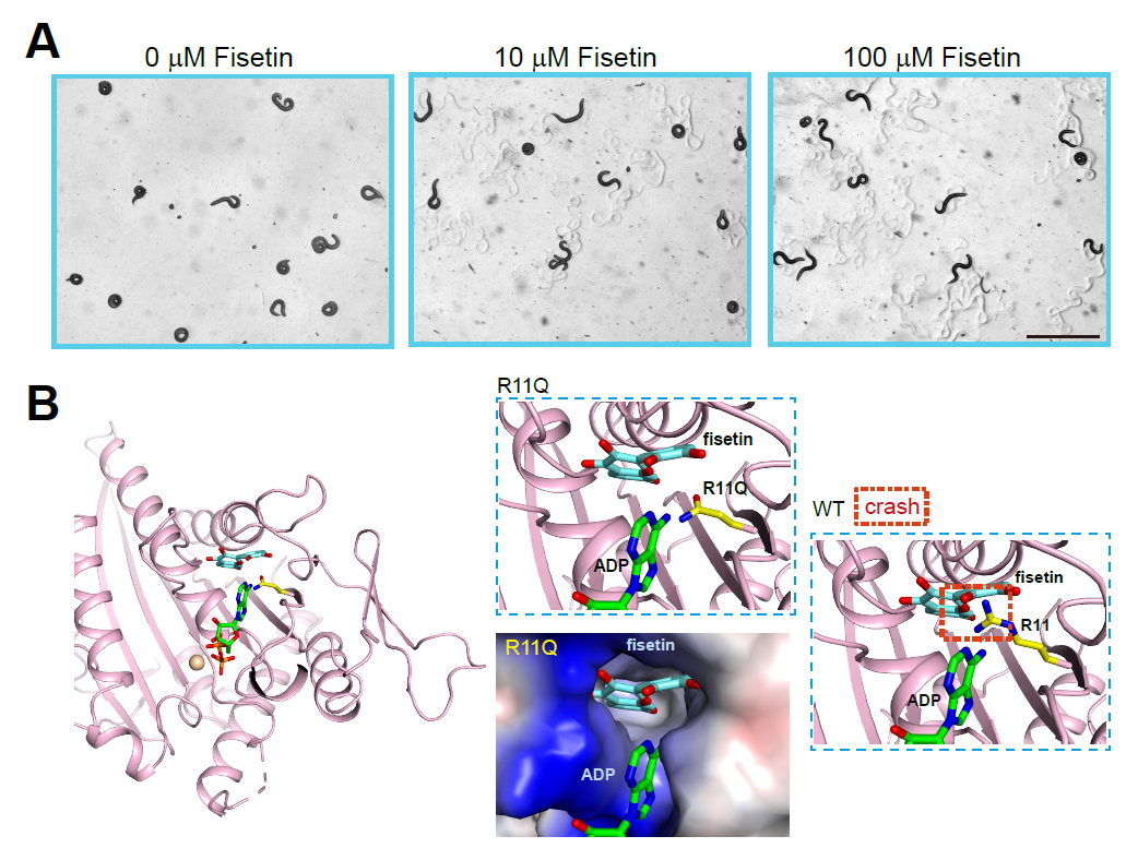 图1.(A)非瑟酮(Fisetin)显著改善KIF1A(R11Q)突变线虫形态方面缺陷;(B)非瑟酮(Fisetin)模拟对接在KIF1A马达结构域(R11Q)突变体ATP结合口袋中的结构模型