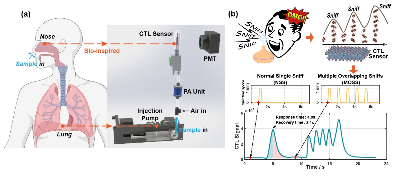 图1.(a)具有仿生肺的电子鼻设备示意图、(b)多重重叠嗅闻(MOSS)策略示意图