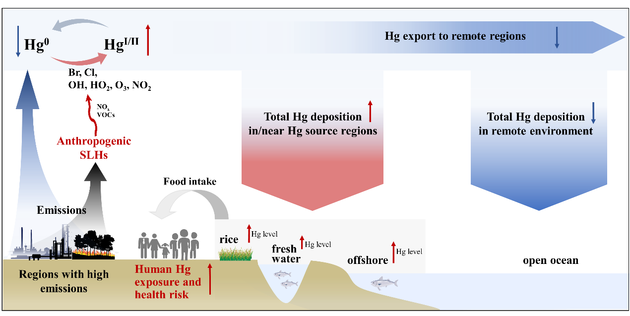 短寿命卤素(大气寿命小于6个月的含氯、溴、碘的物种)可以光解产生卤素自由基直接氧化Hg0,或通过影响其他Hg氧化剂(如OH、HO2和O3等)的浓度,进而影响大气Hg氧化和沉降。以往的研究重点关注海洋排放的短寿命卤素在大气Hg循环中的重要作用。最近的观测证据表明,在大陆地区存在活跃的短寿命卤素化学和人为源排放,但其对大气Hg氧化、沉降及其健康效应的影响尚不清楚。