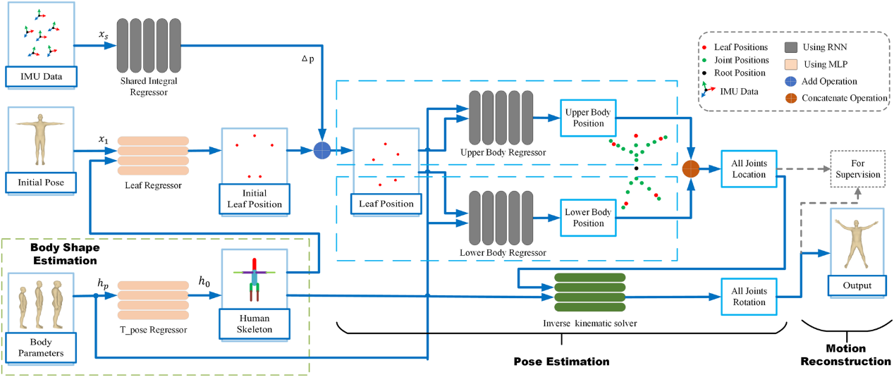 针对以上问题,乐动平台机械系智能制造与精密加工研究室研究人员提出了一种基于六个惯性传感器的新算法结构FIP(Fast Inertial Poser),为便携式终端的部署带来了一种新的思路。该方法分为两个阶段,关节位置估计和运动学逆解。与之前的方法相比,该方法效率提升的主要原因为:第一,消除了额外的优化设计;第二,基于“最小测量原则”,通过考虑人体形状参数(身高、腿长、单臂长)和性别,使用运动学逆求解器和不同传感器的共享模型来增强神经网络结构的表达能力;第三,去除RNN的双向传播机制。在位置估计阶段,FIP使用三个独立的循环神经网络(RNN)来估计叶节点和其余节点的位置。为了使模型推理过程更接近真实的物理过程,FIP使用传感器共享积分RNN来估计叶节点的位置。此外,对于每个RNN,人体参数信息通过嵌入式编码的方式输入到算法网络中。