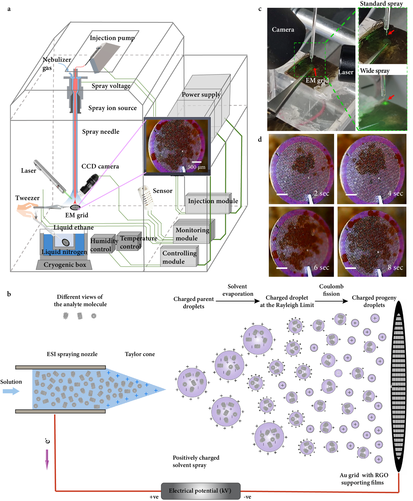 4月25日,乐动平台生命科学学院王宏伟课题组和精密仪器系欧阳证、周晓煜课题组在《自然·方法学》(Nature Methods)在线发表了题为“电喷雾辅助的冷冻电镜样品制备方法用以减轻界面吸附效应”(Electrospray-assisted cryo-EM sample preparation to mitigate interfacial effects)的研究论文。研究采用非变性质谱(Native mass spectrometry, native MS)中广泛使用的电喷雾电离(Electrospray ionization, ESI)技术,设计并搭建了一种新型冷冻样品制备装置ESI-cryoPrep(图1),成功实现了无需滤纸夹吸的冷冻样品制备,并获得了多种生物大分子近原子分辨率的三维结构。
