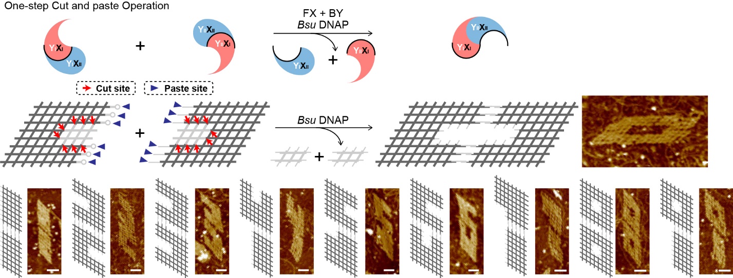 进一步结合两种分子开关的特性,研究团队实现了对核酸纳米结构的一步“剪切+粘贴”操作。对多个结构进行切割的同时,各个结构单位也被连接在一起,组成新的结构样式。利用DNA聚合酶在两种分子开关中的不同识别位点,实现了多种数字形状DNA纳米结构的组装。这些结果也显示了在分子层面上阴阳的相对与相通。