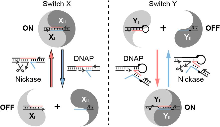 图1.酶介导DNA纳米结构可控重构的阴阳示意图。两种可逆分子开关X(左)和Y(右)由反应路径相反的同两种酶驱动