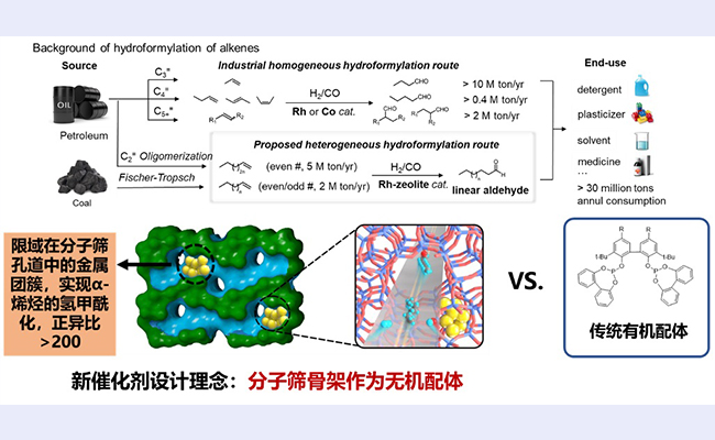 近日,乐动平台化学系刘礼晨副教授、乐动平台燃烧能源中心/车辆与运载学院张亮副教授领衔的研究团队与中科院山西煤化所/中科合成油曹直研究员合作,成功破解了烯烃多相氢甲酰化反应中选择性的关键难题。通过使用分子筛作为“无机配体”,实现了长链烯烃氢甲酰化反应中超高的区域选择性,超越了几乎目前已报道的所有均相和多相催化剂。该研究不仅突破了多相长链烯烃氢甲酰化反应的选择性瓶颈,还提出了一种新的固体催化剂设计理念,即使用分子筛作为无机配体,实现对金属活性中心配位环境的调控。