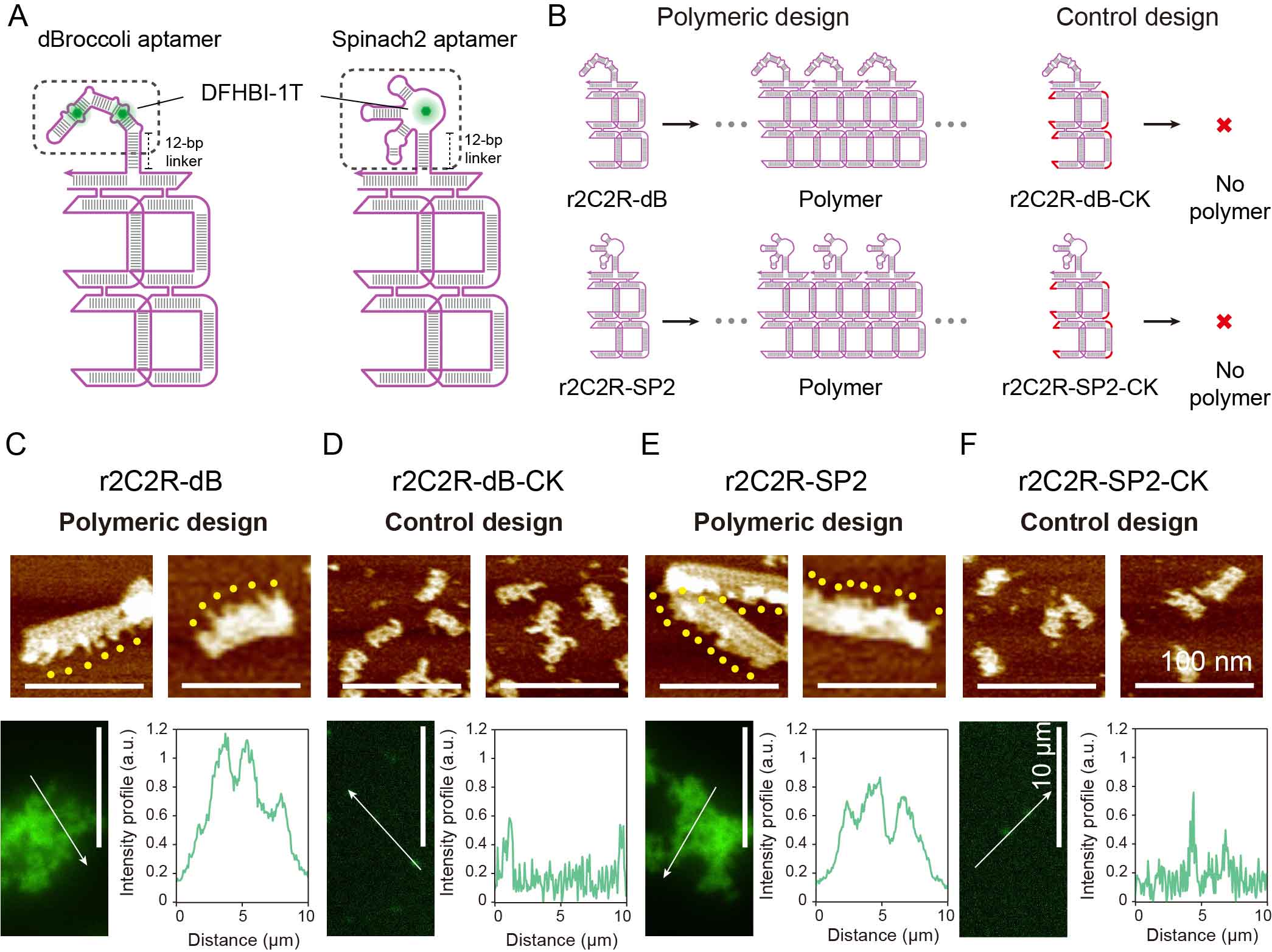 图2.功能化单链RNA网格状纳米结构的构建。(A)两种具有荧光活性的RNA网格状纳米结构示意图。(B)单分散性和可聚集性纳米结构的设计。(C-F)功能化单链RNA网格纳米结构的原子力显微镜和荧光显微镜表征结果