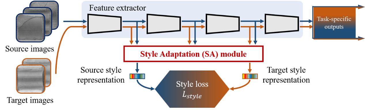 通过观察数据集不同域之间的差异,研究团队针对应用场景提出了一种新的领域自适应方法,回答了迁移学习中的核心问题——任务中“知识的迁移”指的是什么知识、“领域自适应”指的是什么领域。在工业检测应用场景中,源域和目标域为同类型但不同来源的数据,故团队选择定义风格作为其要自适应的领域,并将该方法命名为“风格自适应”(Style Adaptation,SA)。