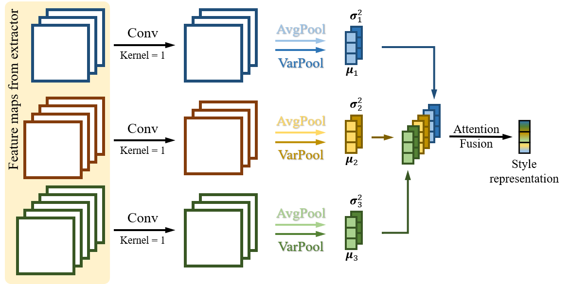 SA模块仍然使用DA类似方法,通道数调整之后提取各分支的风格特征,最后使用注意力机制将各分支融合得到各领域对应的风格表征(style representation)。相较于DA方法,SA方法可解释性更高、超参数更少、更轻量且能更有效消除域偏移现象。