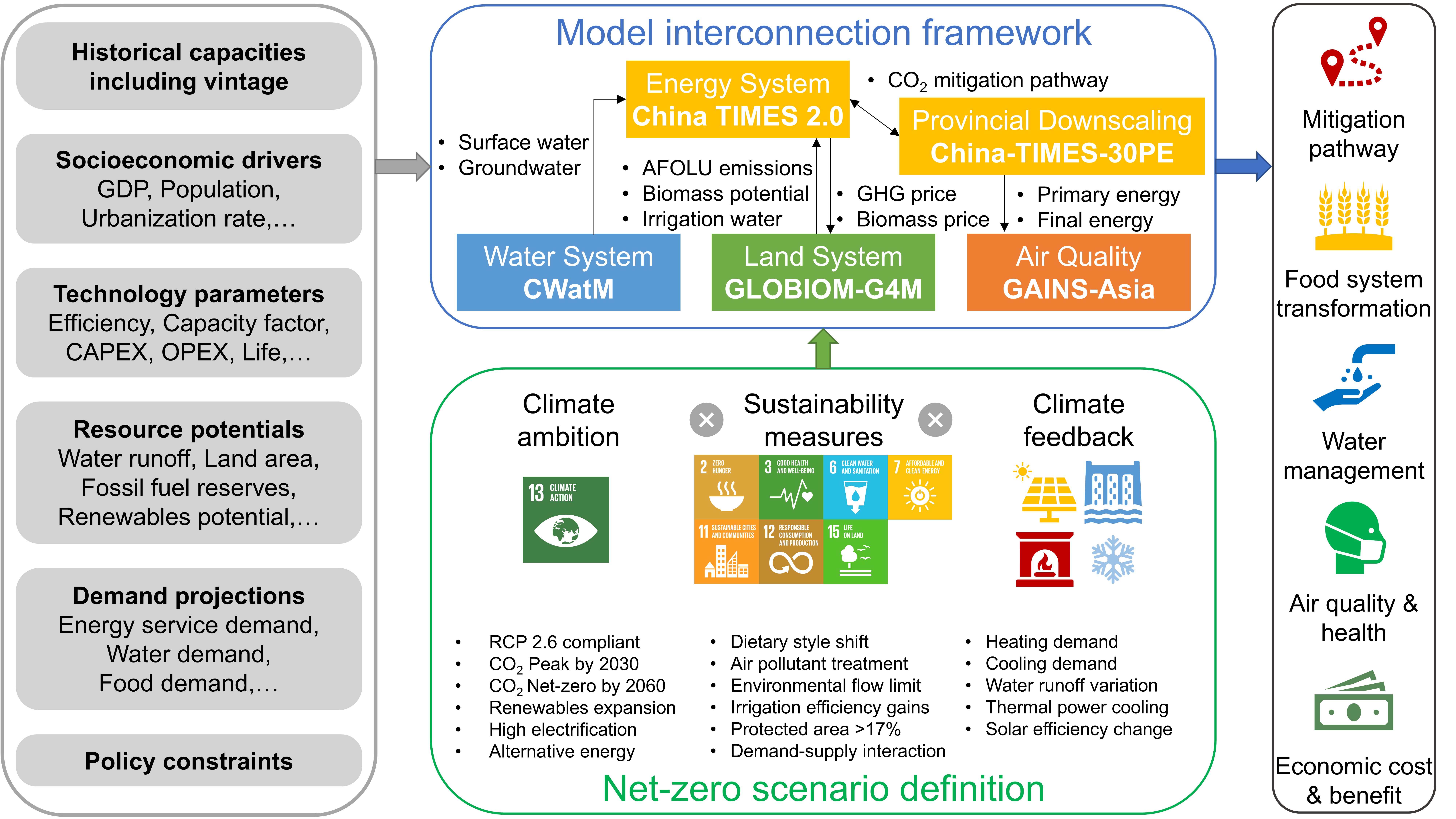 针对这一问题,乐动平台核能与新能源技术研究院(以下简称“核研院”)陈文颖教授课题组和合作团队建立了一套多模型集成框架,实现了国家级能源模型China TIMES 2.0、省区级能源模型China-TIMES-30PE与土地利用模型GLOBIOM-G4M、水资源管理模型CWatM、空气质量模型GAINS-Asia的连接,综合考虑了气候和能源政策、可持续发展措施和气候反馈,探索和量化了中国在实现碳中和目标过程中,对环境相关可持续发展目标的协同效益和潜在权衡。研究成果为中国实现碳达峰碳中和的同时提高能源、土地、水、空气质量系统的可持续性提供了长期转型路径,为中国形成多系统协同的可持续发展方案提供支撑。