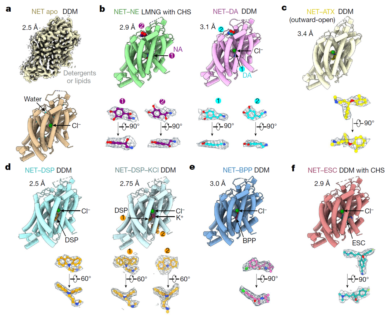图2.人源NET天然状态、结合两种底物和四种抗抑郁药物复合物的冷冻电镜结构