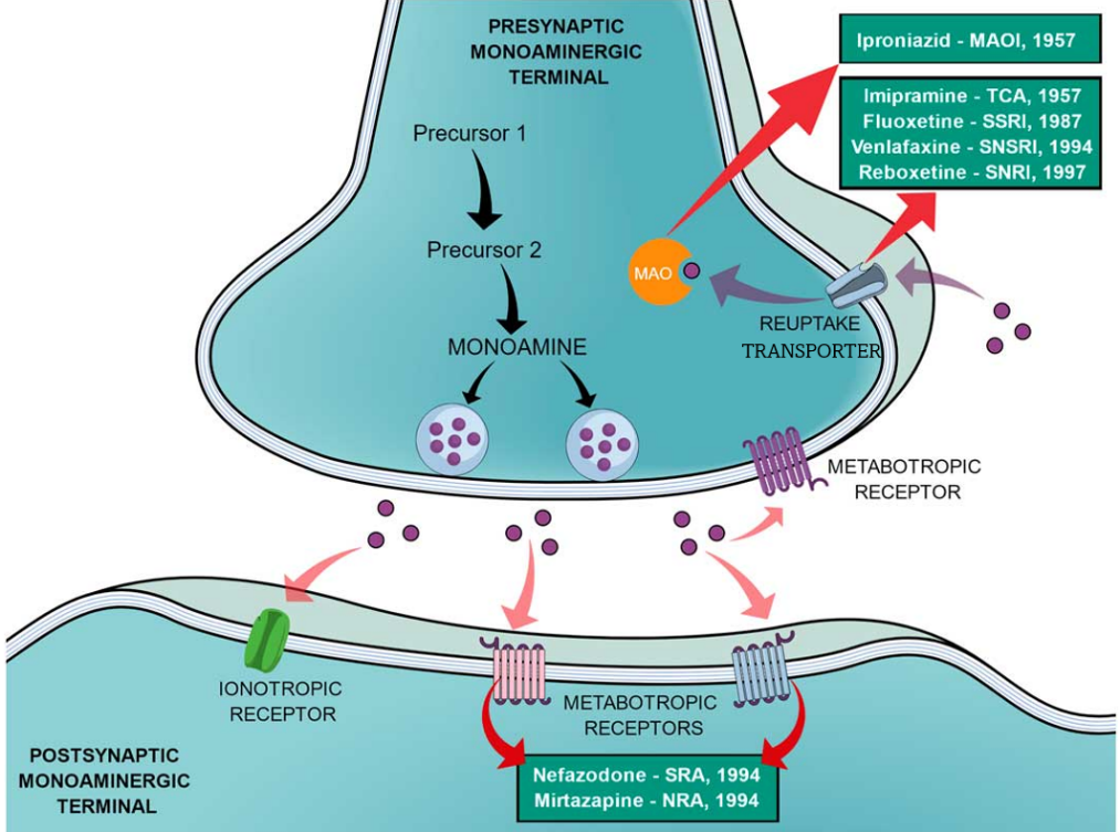 图1.单胺能神经元中神经递质的传递过程及不同抗抑郁药物的作用方式