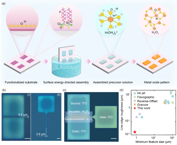 乐动(中国)网8月14日电 金属氧化物薄膜晶体管(TFTs)因其在集成电路领域的广泛应用而备受瞩目。如何实现低成本且高精度的TFTs制造,已成为学术界和产业界共同关注的焦点。近日,乐动平台机械工程系路新春教授团队柴智敏副教授在基于表面能诱导定向组装的电子器件微纳制造领域取得进展。其提出一种基于湿度控制的“表面能导向组装”(surface energy-directed assembly,SEDA)工艺(图1),全溶液制备了分辨率800nm、线边缘粗糙度16nm的电子器件,边缘粗糙度优于目前印刷电子工艺两个数量级,为微纳制造开辟了一条高分辨率、高形状精度和低成本的新路径。