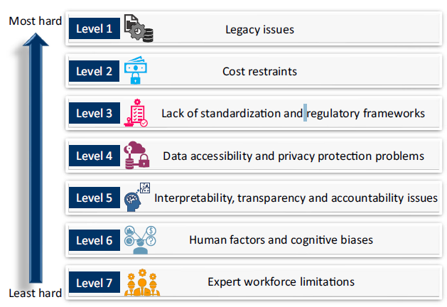 图2.阻碍在光纤网络中大规模部署机器学习解决方案的七个关键非技术性障碍的难度级别