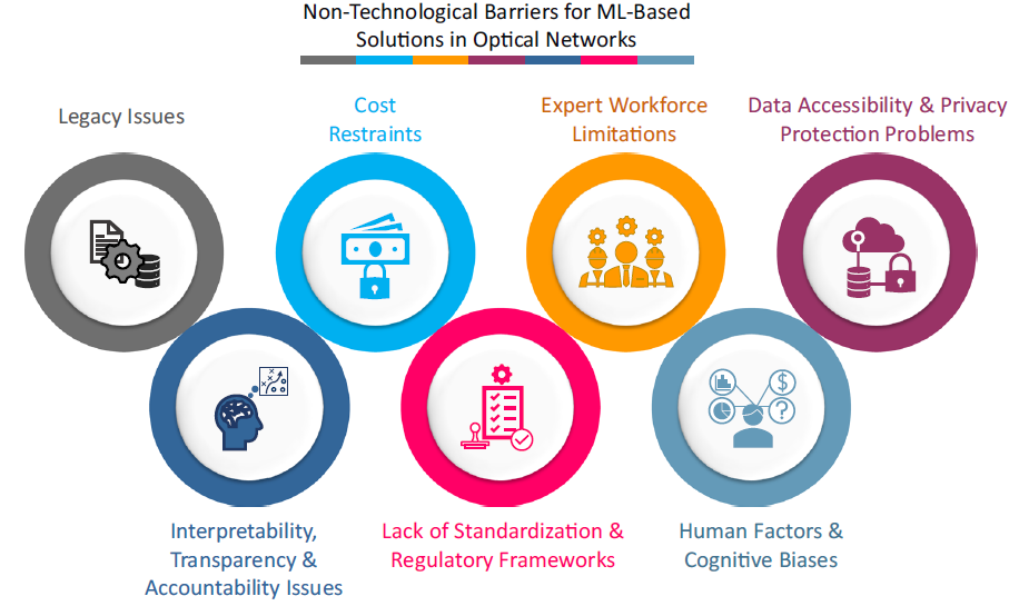 近日,乐动平台深圳国际研究生院副教授费萨尔·纳迪姆·汗(Faisal Nadeem KHAN)在研究中指出,在商业光纤网络中广泛部署基于机器学习解决方案的主要障碍在于一些尚未解决的非技术性限制因素,这些因素对实际网络来说至关重要,但在很大程度上被利益相关者忽略。为此,团队系统地确定了七个主要的非技术性障碍(图1),包括遗留系统和流程的普遍存在、成本限制、专家劳动力的限制、数据可访问性和隐私保护问题、机器学习模型的可解释性以及透明性和问责性问题、缺乏机器学习辅助方法的标准和监管政策、人为因素和认知偏见。