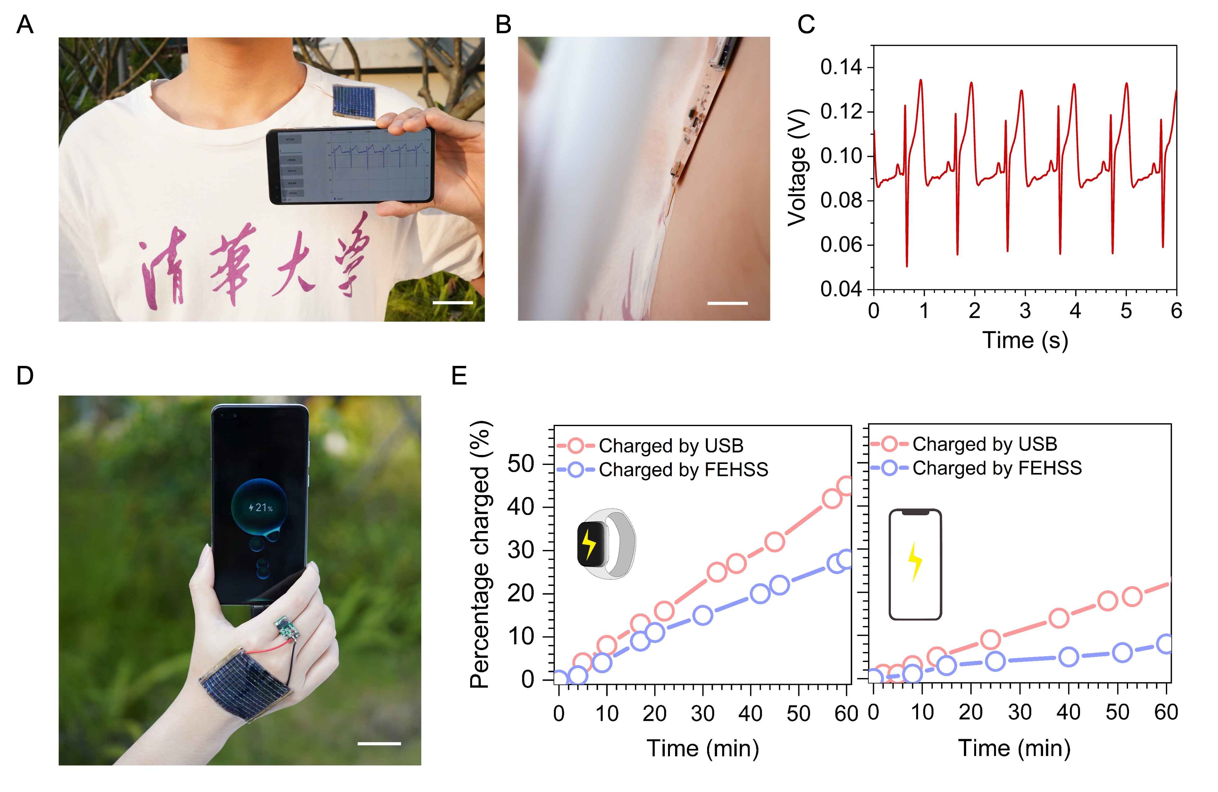 FEHSS可以在自然环境下驱动多种电子设备(图6)。由超柔性OPV和三个ZIB集成的FEHSS具有高于5.82 mWh cm-2的能量密度和5.4 V的输出电压。FEHSS集成于织物上,可驱动心电信号采集并实时传输至手机终端,助力健康管理。FEHSS亦可在不干扰用户活动的情况下为智能手机、手表充电,是新型的户外绿色能源方案。