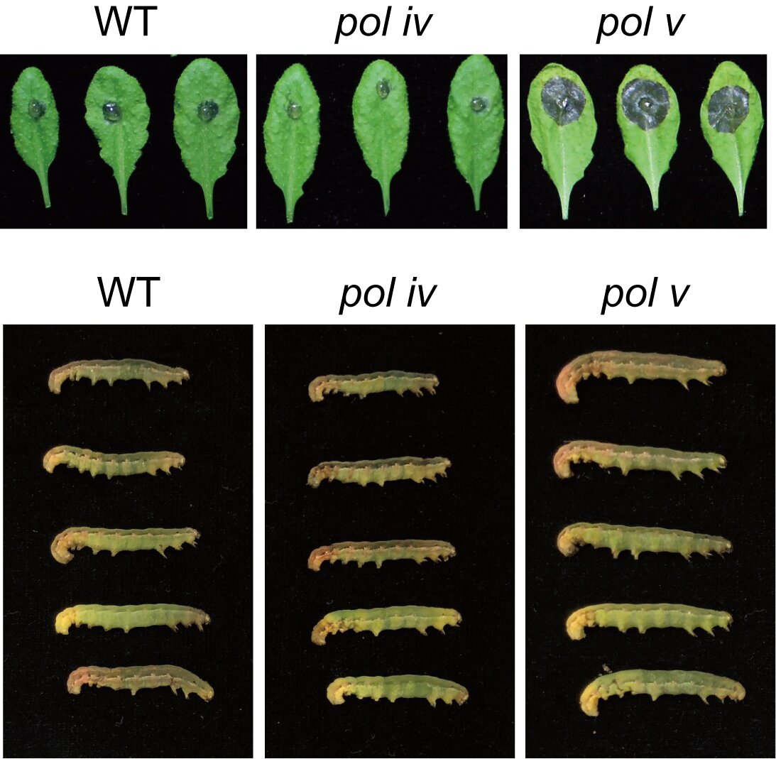 乐动(中国)网8月28日电 真核生物有三种非常保守的RNA聚合酶,Pol I、Pol II和Pol III,它们分别产生rRNA、mRNA和tRNA等不同种类的RNA。而在植物中,还存在两种额外的RNA聚合酶,Pol IV和Pol V。Pol IV和Pol V转录本在RNA介导的DNA甲基化(RdDM)通路中发挥关键作用。其中,Pol IV转录本可被加工成24-nt siRNA,siRNA与AGO4蛋白结合,并通过与Pol V转录本互补配对,将AGO4复合物招募至靶标位点,介导DNA从头甲基化。乐动平台生命学院戚益军课题组前期发现,与野生型相比,昆虫更喜欢取食pol v突变体叶片,而对pol iv突变体并无明显偏好。他们由此推测,Pol V在植物抗虫过程中有异于Pol IV或RdDM的独特功能。经深入研究,最终揭示Pol V转录本以独立于RdDM通路的方式,促进邻近基因的转录,从而正向调控植物对灰霉和甜菜夜蛾的抗性。