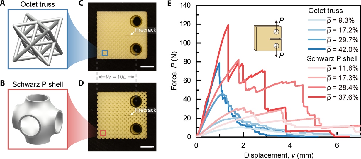 图2.桁架和曲壳点阵超材料的断裂韧性和断裂行为对比