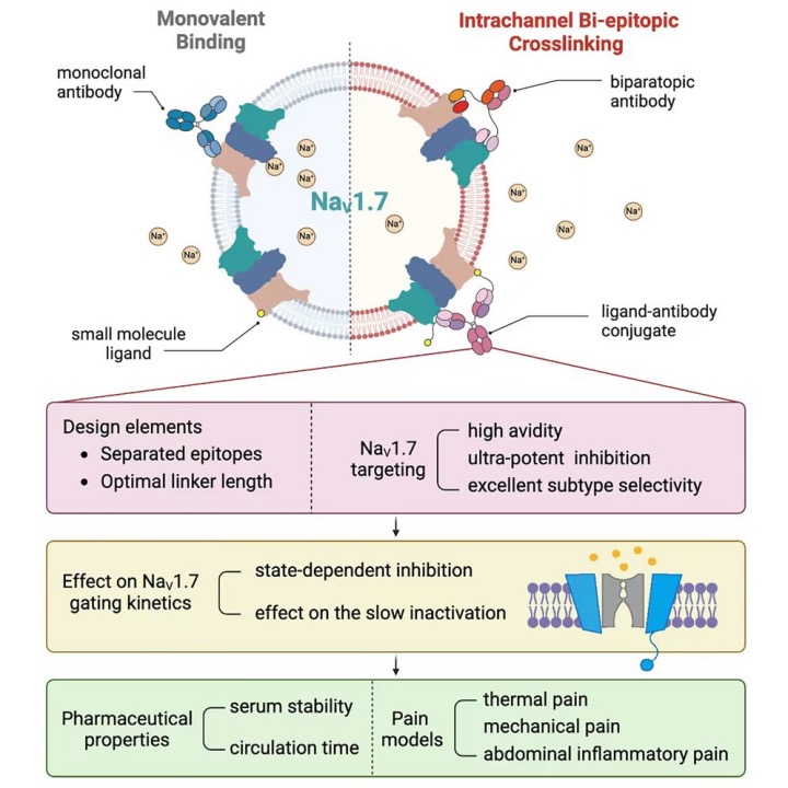 相关研究成果以“通过‘通道内双表位交联策略’针对电压门控钠通道NaV1.7构建了强效且具有选择性的抗NaV1.7抗体”(Intra-channel bi-epitopic crosslinking unleashes ultrapotent antibodies targeting NaV1.7 for pain alleviation)为题,于10月25日发表于《细胞医学报道》(Cell Reports Medicine)。