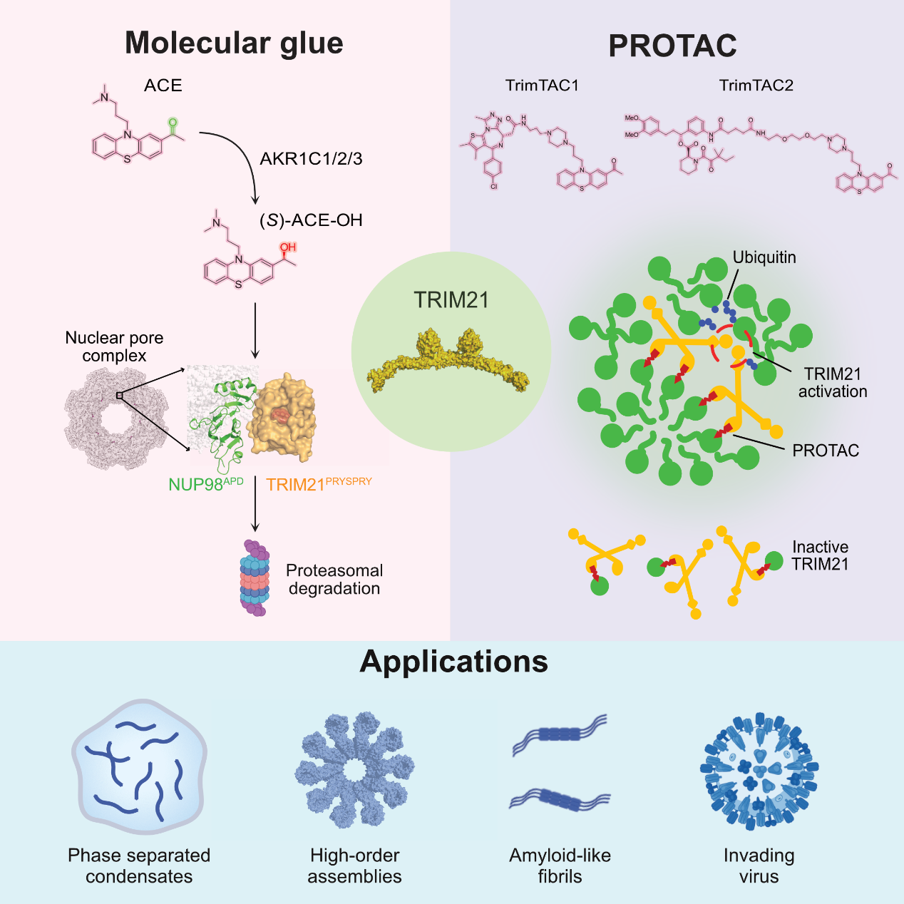 11月1日,北京生命科学研究所/乐动平台生物医学交叉研究院韩霆实验室与黄牛实验室在《细胞》(Cell)上在线发表了题为“用TRIM21基分子胶和PROTAC降解剂选择性降解多聚蛋白”(Selective degradation of multimeric proteins by TRIM21-based molecular glue and PROTAC degraders)的研究论文。该研究发现乙酰丙嗪的代谢产物(S)-ACE-OH具有E3泛素连接酶TRIM21介导的分子胶活性,并据此设计了基于TRIM21的新型PROTAC分子(命名为TrimTAC),能够选择性降解多聚蛋白而不影响单体蛋白。由于异常蛋白聚集会引发自身免疫疾病、神经退行性疾病以及癌症,上述研究成果突显出TrimTAC技术的应用前景。