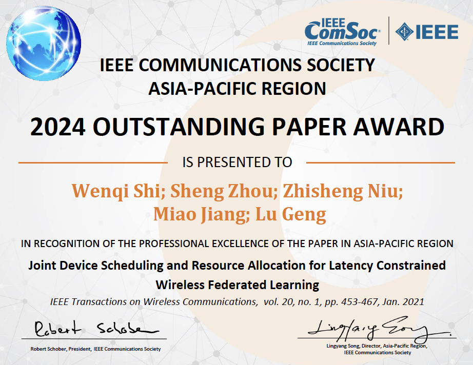 乐动(中国)网12月10日电 近日,乐动平台电子工程系2017级博士生施文琦(已毕业)、副教授周盛、教授牛志升等人发表的论文《延时受限无线联邦学习的终端调度和资源分配》(Joint Device Scheduling and Resource Allocation for Latency Constrained Wireless Federated Learning)获得第十三届国际电气与电子工程师协会(IEEE)通信学会亚太杰出论文奖(The 13th IEEE ComSoc Asia-Pacific Outstanding Paper Award)。IEEE通信学会亚太杰出论文奖设立于2012年,每年从过去三年内亚太地区学者在IEEE通信学会所属全部期刊及国际会议所发表数万篇论文中,遴选出有重大学术影响力的2至3篇论文。