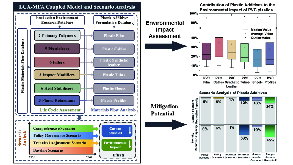 塑料主要由树脂、助剂等化学物质构成。塑料助剂不仅改善了产品的流动性、成型性和稳定性,还增强了其功能性,对塑料制造业至关重要。随着全球塑料产量的持续增长,对塑料助剂的需求也迅速上升。要有效解决塑料污染问题,就必须掌握塑料对环境影响的全面信息。然而,塑料助剂的环境影响常常被忽视,以往研究通常仅关注树脂,特别是在摇篮到大门的生命周期阶段,缺乏对更广泛的塑料助剂化学品环境影响的评估。课题组含塑料助剂比例最大的PVC塑料为切入点,首次从系统层面揭示了不同类别的典型塑料助剂化学品的生命周期环境影响全貌和其对PVC塑料制品环境影响的显著贡献,同时确定塑料助剂生命周期环境影响的关键减排策略,为塑料污染治理提供关键科学信息。