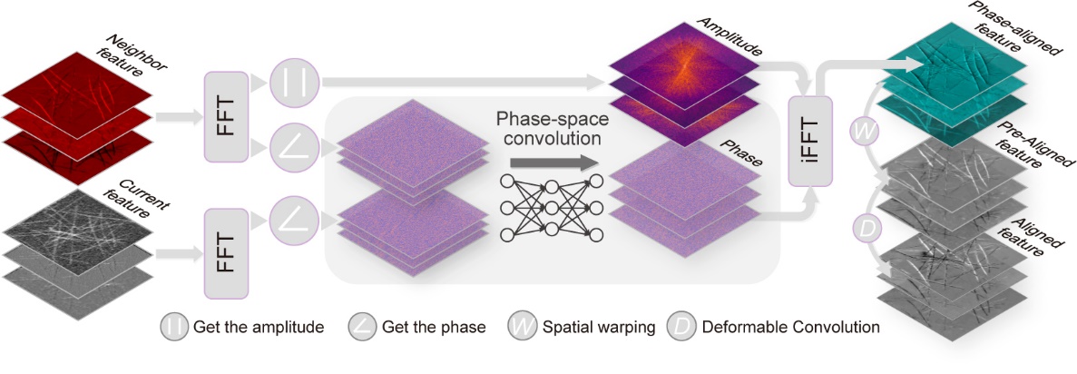 研究团队首先构建了一个大规模、高质量的时序超分辨图像数据集BioTISR,并利用这一数据集对TISR方法的两个关键组成部分,即传播机制(propagation)和校准机制(alignment)进行了全面、系统的测评。测评结果表明,现有方法中最先进的可变形卷积校准机制依然无法合理捕捉相邻帧中生物结构的全局、大幅位移,导致整体超分辨重建并不理想。针对这一问题,团队设计了一种以相空间校准(图1)为基础的时间序列图像超分辨神经网络模型DPA-TISR,该模型能够在相位域中自适应地增强跨帧对齐能力,并且实现了当前最优的TISR性能。BioTISR数据集与DPA-TISR模型共同为超分辨显微成像领域建立了一个时序显微图像超分辨模型的平台(benchmark)与基准(baseline),将进一步推动AI社区与光学显微成像领域的深度融合与交叉创新。