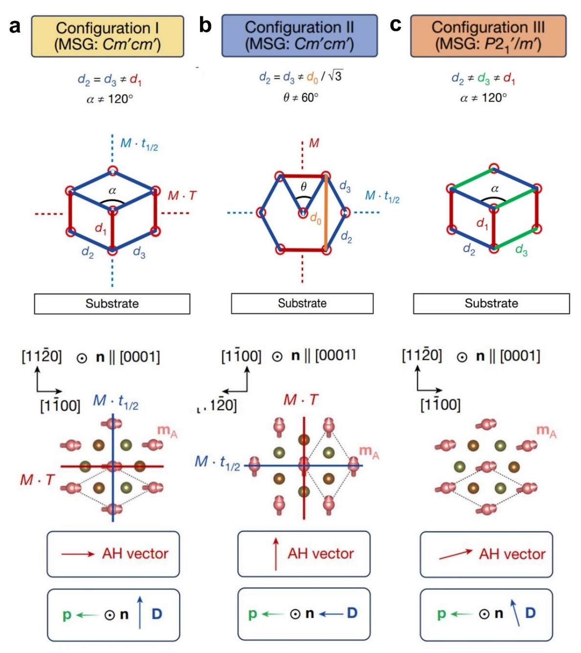 基于上述认识,该研究通过综合基片选择和生长条件控制等手段,生长出了高对称晶面(0001)面垂直于基片表面的CrSb薄膜,在保持奈尔矢量的易轴取向不变的条件下成功诱发了CrSb中不同类型的晶格畸变,从而实现了镜面对称性的破缺和磁空间群的转换(图2)。交错磁体序参量也随着磁空间群的转换而发生了重构,成功地在晶体对称性维度实现了对交错磁体的调控。这不仅意味着能够产生沿不同方向的反常霍尔矢量,而且能够改变两个磁性子晶格之间的磁相互作用的形式,产生不同取向的Dzyaloshinskii-Moriya矢量。