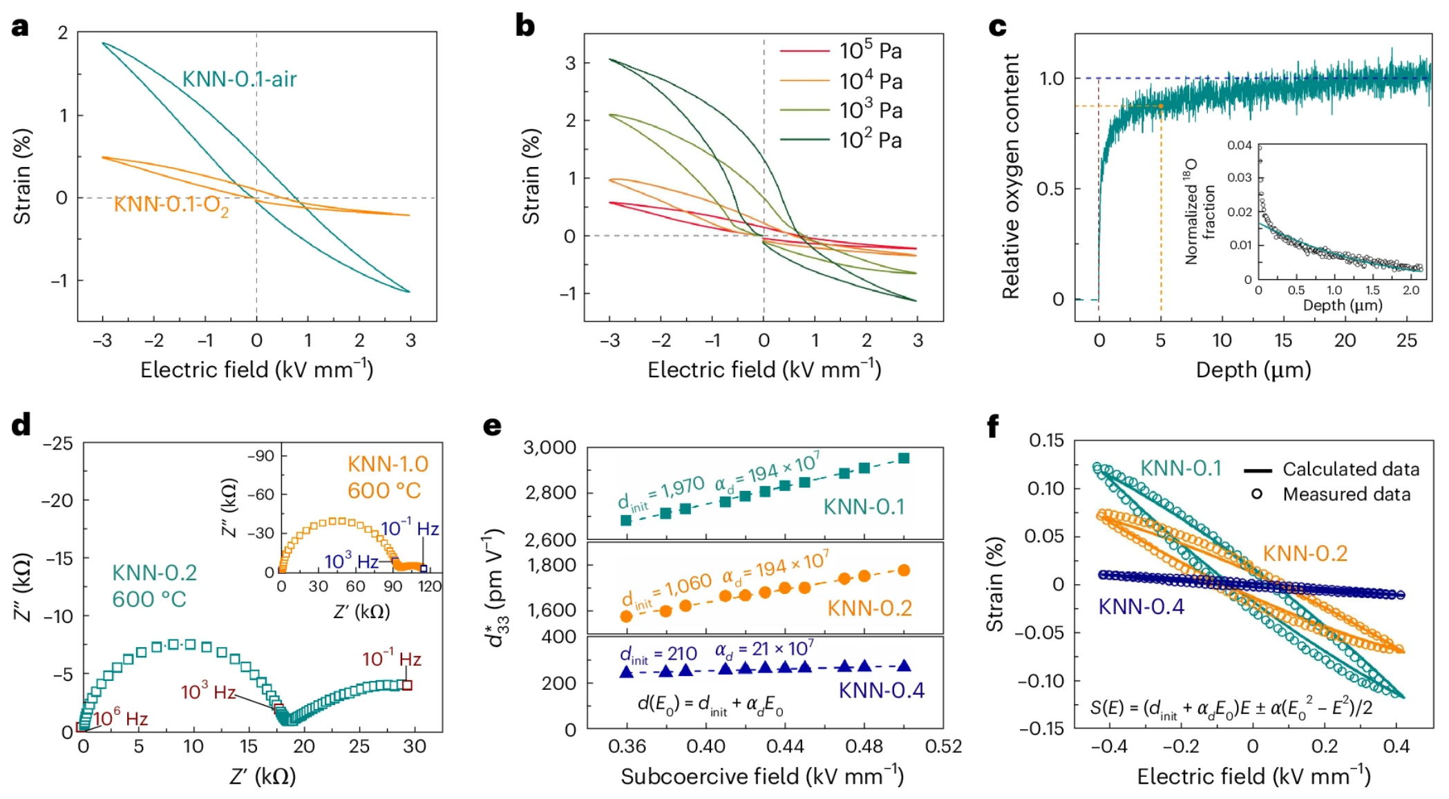 基于此,研究团队提出了“化学压电效应”(Chemopiezoelectric effect)这一新概念,用以描述压电材料中线性压电效应、铁电畴翻转、电致伸缩以及氧空位短程跃迁共同作用下的复杂电致应变现象,该效应与氧空位浓度及其迁移能力密切相关。该研究验证了KNN压电陶瓷中氧空位的非均匀分布,阐释了氧空位短程迁移机制,为压电陶瓷及其他氧化物材料的缺陷-性能关系提供了新的分析视角。此外,该KNN压电陶瓷还展现出良好的频率稳定性、温度稳定性和抗疲劳性能,具有通过叠层技术实现在压电多层驱动器中应用的潜力。