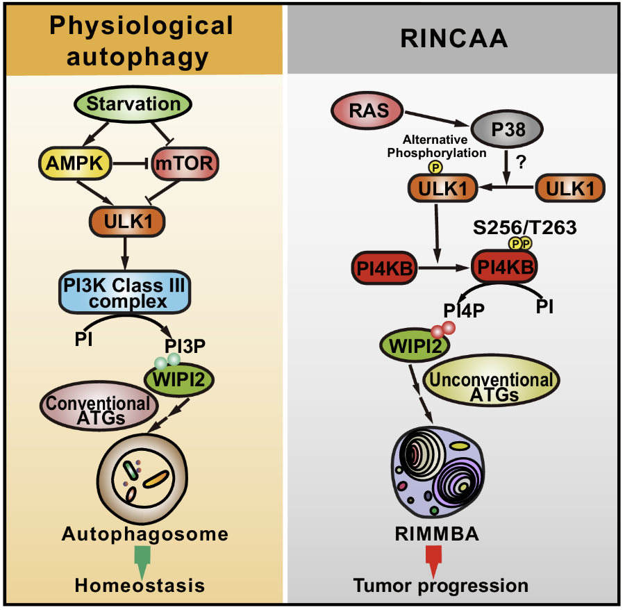 图2. 电镜观察饥饿诱导的自噬体与RAS诱导的RIMMBA RINCAA的一个显著特征是经典自噬通路中的PI3K被替换为PI4KB。研究者鉴定了P38-ULK1-PI4KB-WIPI2级联信号控制这一过程,KRAS激活下游P38通路,进一步促进ULK1的激活。激活的ULK1促进PI4KB在S256和T263位点磷酸化并促进PI4P的产生,WIPI2作为PI4P效应器招募ATG16L1/ATG12-ATG5酯化复合体促进ATG8ylation和非经典自噬体的形成