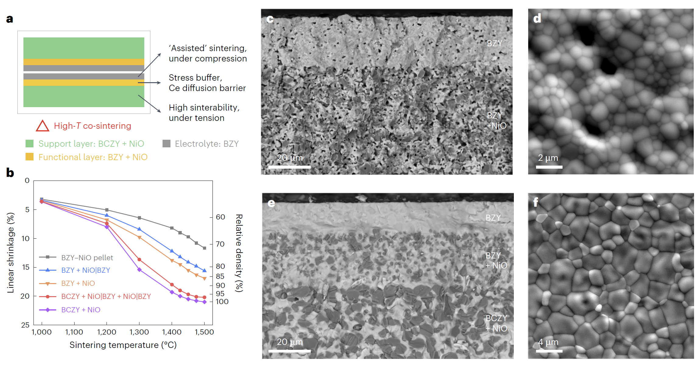 基于上述背景,乐动平台材料学院董岩皓助理教授与合作者美国新墨西哥州立大学罗红梅教授、美国麻省理工学院李巨教授和美国爱达荷国家实验室丁冬研究员提出了基于高活性支撑层烧结应力辅助的多层共烧技术,通过支撑层、过渡层和质子膜中氧化镍第二相和铈掺杂浓度的一体化设计,首次在1450摄氏度实现了无烧结助剂、高致密度锆酸钡基质子膜和高性能电化学器件的制备(图1)。研究表明,锆酸钡基质子膜燃料电池和电解池具有优异的电化学性能和稳定性(图2),能够在450至600摄氏度、0.5至0.7个大气压的高水蒸气分压和0.5至2.0安培每平方厘米的高电解电流下展现出高法拉第效率和优异的稳定性,相较于传统的铈酸钡基电解质优势明显。锆酸钡陶瓷烧结技术的突破,有望为高功率密度陶瓷质子膜燃料电池和极端工况电解池的研发与应用提供有力支撑。