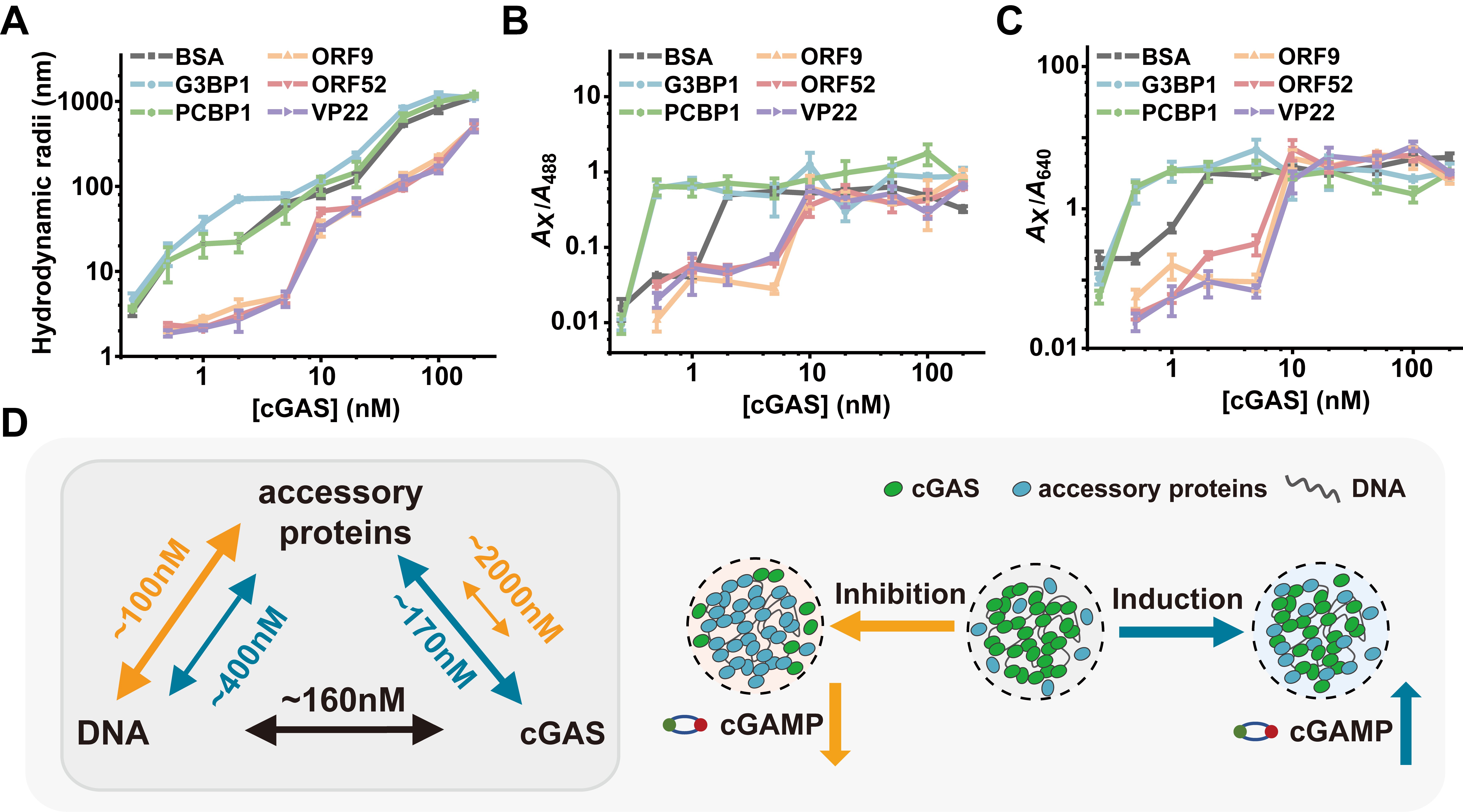 蛋白G3BP1和PCBP1能够促进cGAS的相分离并增强其活性,而病毒外壳蛋白来源的蛋白ORF9、ORF52及VP22则具有抑制作用。dcFCCS的定量表征揭示,发挥抑制作用的辅助蛋白显著降低了凝集物的水合半径,提高了相分离临界浓度;而发挥促进作用的辅助蛋白增大了凝集物的水合半径,降低了相分离临界浓度。进一步实验表明,两类蛋白与cGAS亲和力存在显著差异。促进蛋白与cGAS和dsDNA均可以发生较稳定的相互作用,从而促进三元相分离的发生,提高低浓度下cGAS的活性;抑制蛋白与dsDNA结合较强,而与cGAS结合较弱,因而得以阻碍cGAS与dsDNA的结合、相分离从而抑制cGAS的激活。
