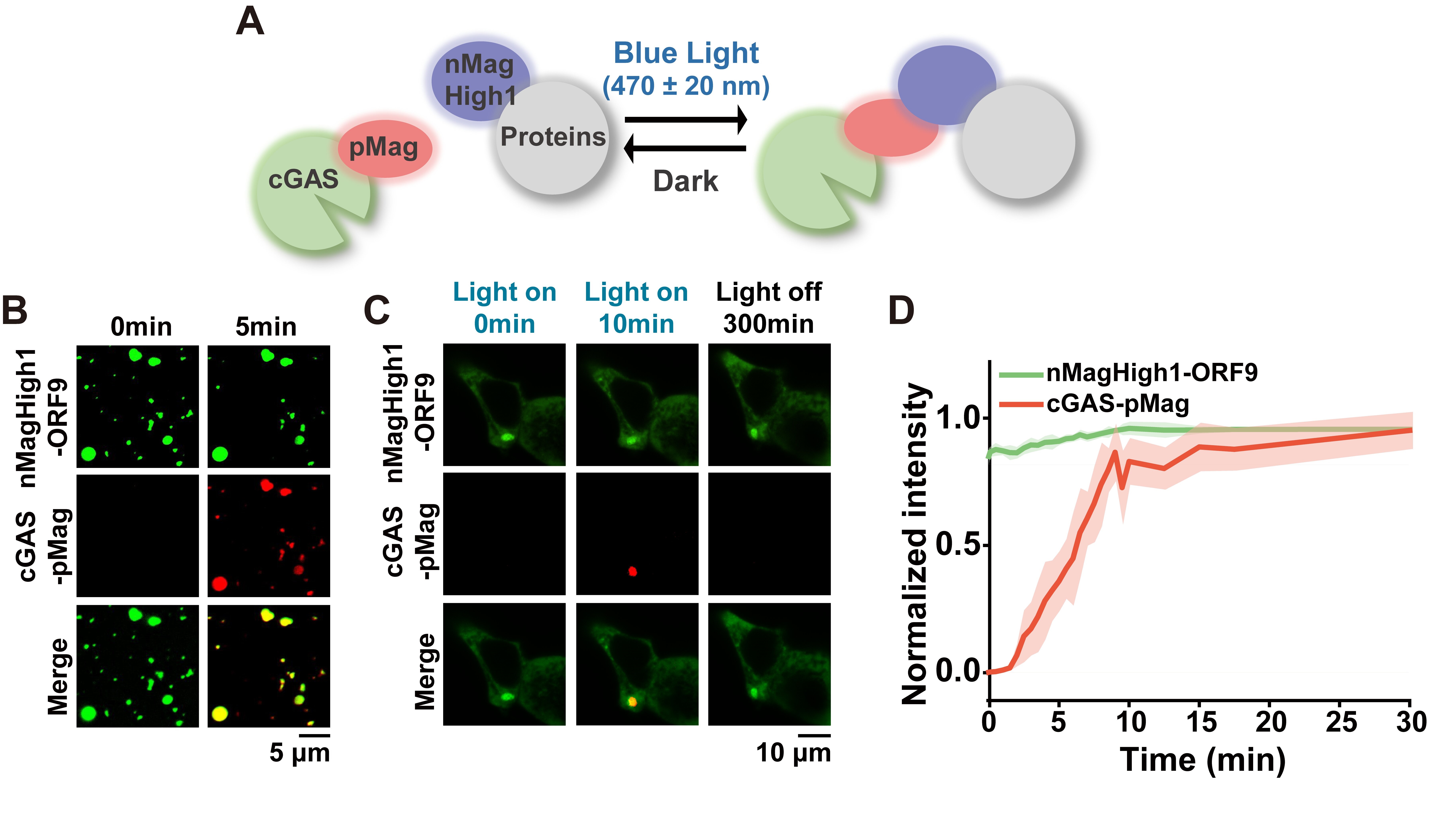 光控诱导往往比化学诱导具有更高的空间可控性。研究人员利用蓝光照射促使pMag-nMagHigh1二聚化,从而增强nMagHigh1-抑制蛋白与cGAS-pMag的亲和力,诱导cGAS快速相分离。在活细胞中,该光控分子开关可逆地调控cGAS相分离,蓝光终止后,cGAS凝集体逐渐解离。