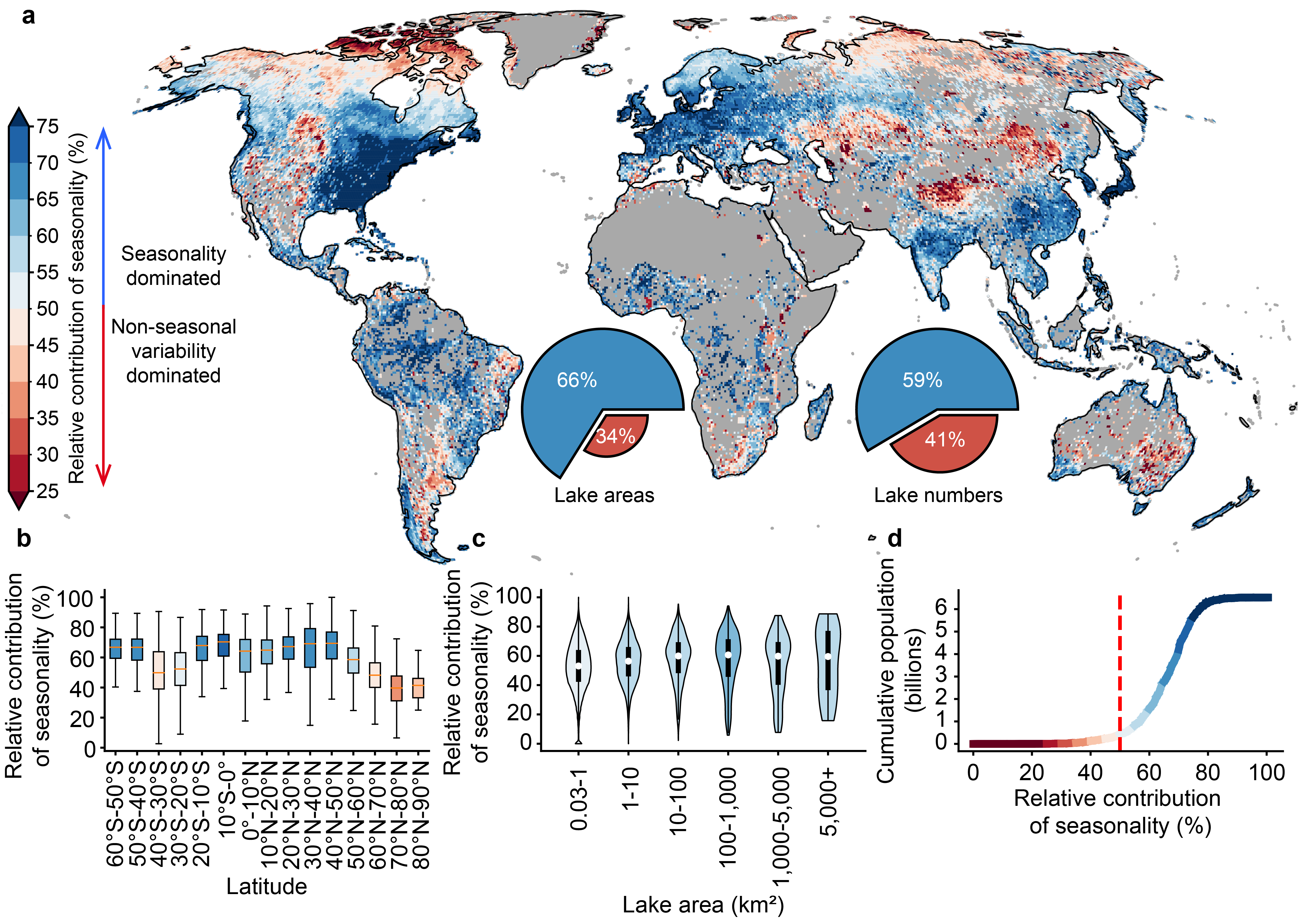 研究显示,全球66%的湖泊总面积和59%的湖泊数量,其水域面积动态以季节性变化为主导(图2)。更为重要的是,这一季节性主导分布格局与全球人口分布之间存在高度耦合关系──全球90%以上人口居住在以季节性主导湖泊为主的流域。这一发现从全球尺度上揭示了人类活动区域与水文季节性变化之间的深层联系,预示着湖泊水文过程正日益受季节性极端事件与人为调控的双重驱动。此外,研究发现季节性极端事件可在短期内显著放大或抵消湖泊几十年来的长期趋势。这一机制为理解极端气候事件对湖泊生态系统和水资源安全的冲击提供了科学依据,也为未来湖泊温室气体通量估算、生态生境保护及极端水文事件响应策略的制定提供了理论支撑。