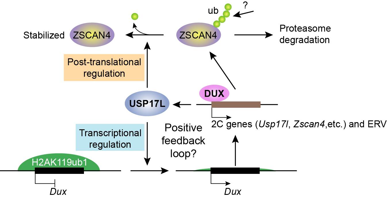 在小鼠胚胎干细胞中,Usp17l敲低或过表达可以显著抑制或促进2C基因的转录。而在Usp17l过表达的细胞中敲低Dux时,原本上调的2C基因呈现部分下调趋势,表明Usp17l对2C基因的激活可能通过Dux依赖和非依赖的途径来实现。进一步研究发现,Dux基因位点富集抑制性组蛋白修饰H2AK119ub1。作为去泛素化酶,USP17L(主要是USP17LE)可以降低H2AK119ub1在Dux上的富集,进而激活Dux及下游2C基因的表达。有意思的是,已有研究表明Usp17l也是DUX的靶基因,因此DUX和USP17L之间的相互调节可能构成一个正反馈回路,有助于快速诱导2C基因的表达。另外,研究团队还发现USP17L的过表达提高了ZSCAN4蛋白的水平,并且胚胎干细胞中Zscan4+细胞(2-细胞样细胞)比例也有所增加。进一步机制研究表明,USP17LE可通过直接结合ZSCAN4,去除ZSCAN4上的泛素化修饰进而抑制其被蛋白酶体降解。