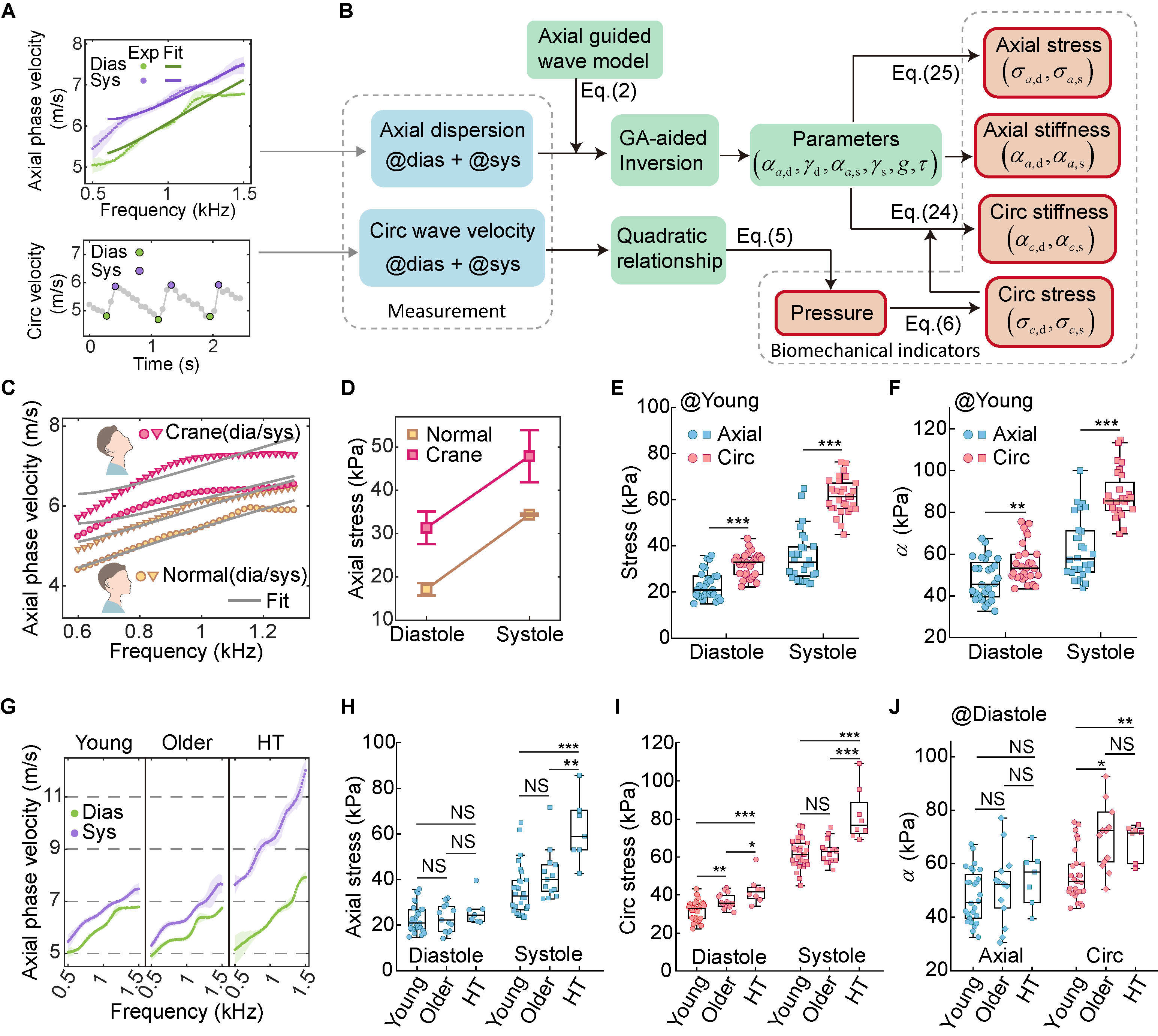 图3.动脉双向应力与双向刚度的表征。(A)上侧:舒张末期与收缩峰期的轴向导波频散的在体测量结果;下侧:一个心动周期内环向导波波速的在体测量结果。(B)动脉生物力学指标的表征流程图,包括血压、双向应力及双向刚度的表征方法。(C)两种体姿(正常体姿与伸颈体姿)下的轴向导波频散曲线。(D)两种体姿下舒张末期与收缩峰期的轴向应力表征结果。正常体姿下,舒张末期与收缩峰期的轴向应力分别为17.2±1.4kPa和34.4±0.2kPa;伸颈体姿下分别为31.3±3.8kPa和47.9±6.0kPa。(E)年轻组中舒张末期与收缩峰期的双向应力对比。(F)年轻组中舒张末期与收缩峰期的双向动脉刚度对比。(G)三名分别来自年轻组、中老年正常血压组和中老年高血压组的志愿者的轴向导波频散测量结果。(H)三组人群在舒张末期与收缩峰期的轴向应力对比。(I)三组人群在舒张末期与收缩峰期的环向应力对比。(J)三组人群在舒张末期的轴向刚度与环向刚度对比