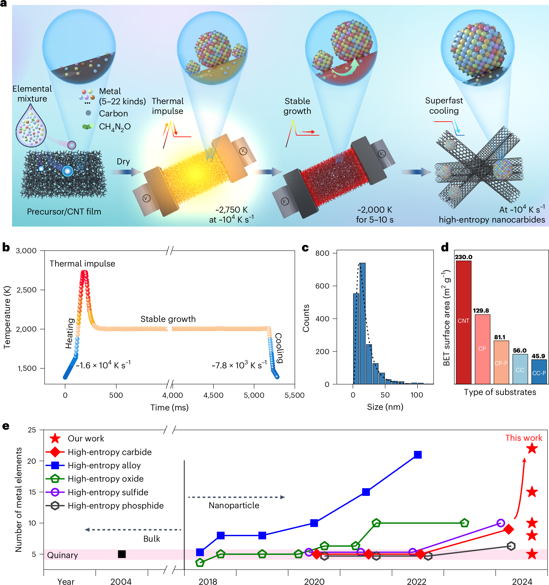 相关研究成果以“纳米限域脉冲合成高活性与稳定性的电催化剂”(Nanoconfined Impulse Synthesis of High-Entropy Nanocarbides for Highly Active and Stable Electrocatalysts)为题,近日在线发表于《自然·合成》(Nature Synthesis)。