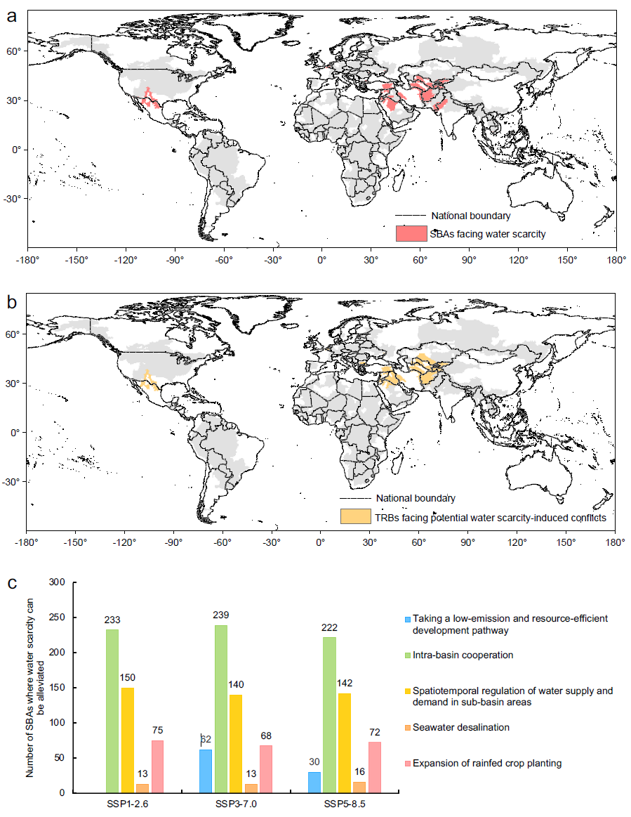 研究还全面评估了不同应对策略的有效性,包括低排放发展路径、流域内跨境合作、子流域调度管理、海水淡化和扩大雨养作物种植。结果表明,跨境合作是最有效的措施,可缓解约60%的缺水子流域问题。如果多种措施同时实施,预计仅有20条国际河流(约占总数的8%)仍存在冲突风险(图2)。这一发现凸显了加大投资和促进利益相关方积极参与的紧迫性,以推动跨境水资源合作,防范潜在冲突。