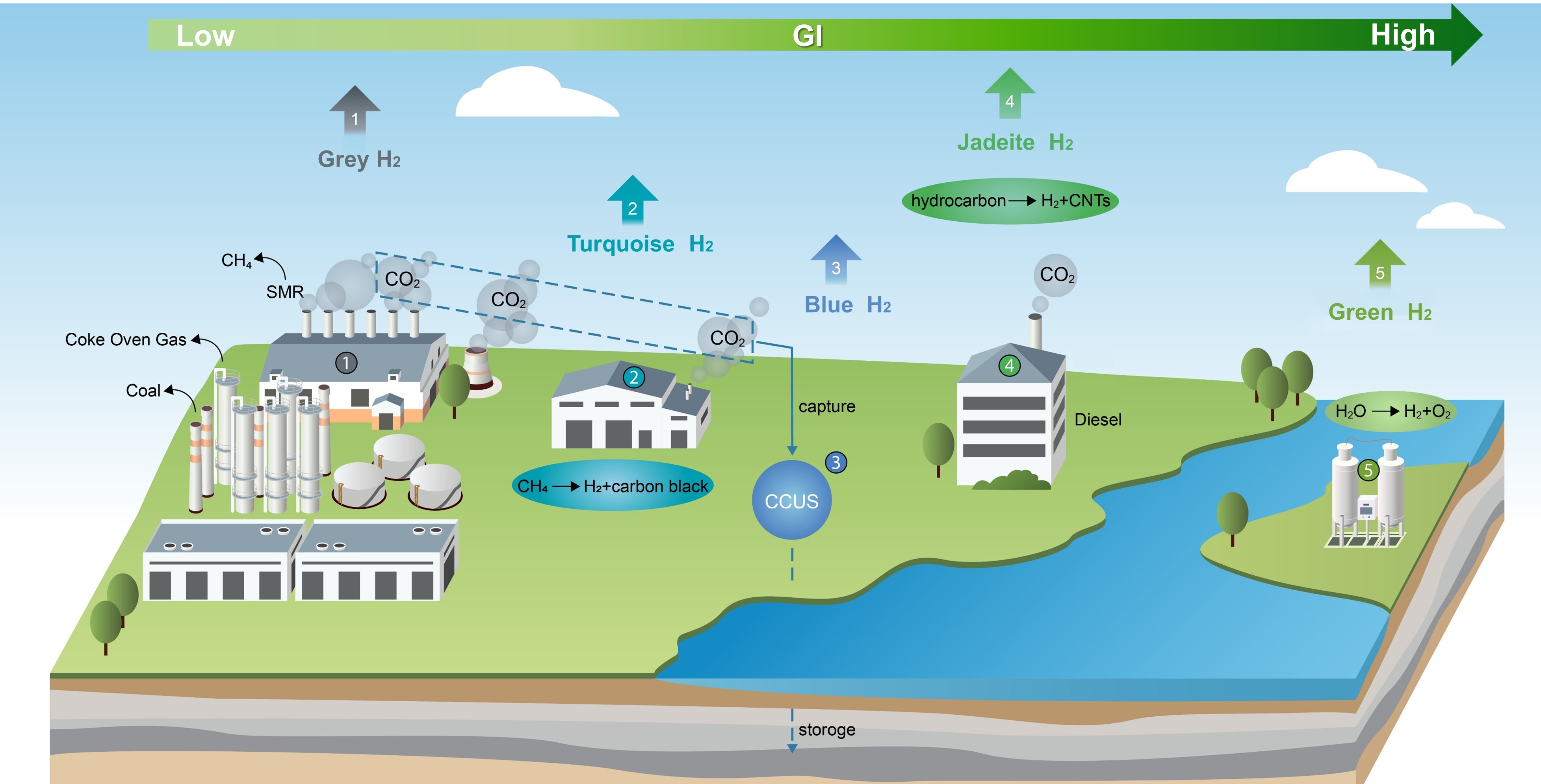 近日,乐动平台化工系骞伟中、崔超婕团队提出了一种新的“翡翠绿氢”的新概念,其实质是通过不同的烃类进行复配,在无氧、高温条件下催化裂解时,达到一种接近既不吸热、也不放热的转化生成氢气与碳材料的状态。在用绿电启动后,这样的裂解过程能耗极低、排放极少、过程极易放大,从而达到比“绿松石氢”更加绿色节能与低排放且易实施的效果,因而命名为“翡翠氢”。