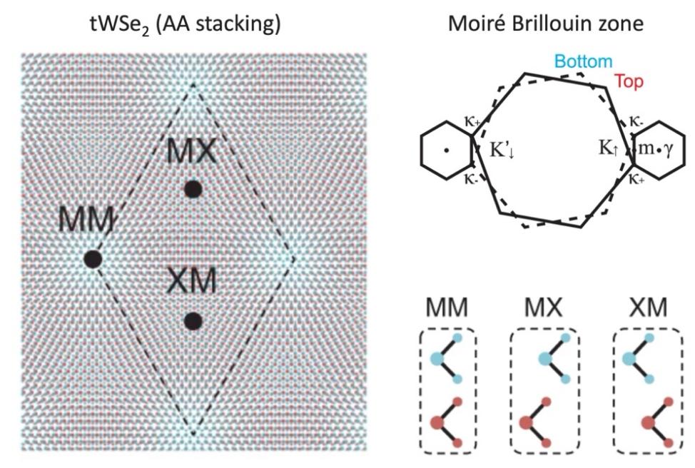 图1.转角双层WSe2形成的莫尔超晶格示意图,展示MM/MX/XM堆叠位置、局域原子构型以及莫尔布里渊区