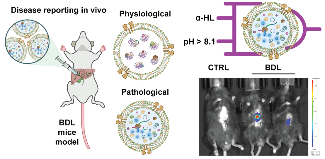 最后,研究团队建立了胆总管结扎(BDL)小鼠模型,在活体中证实该模型肝内胆管区域存在一个稳定的局部碱性微环境(pH ≈ 8.3)。活体生物发光成像结果清晰地显示,在小鼠体内,人工细胞成功感知到局部的碱性信号,其内部的聚集体被解离,激活了CFPS进行荧光素酶的合成,最终产生了强烈且高度局域化的生物发光信号(图4)。