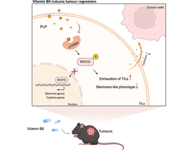 维生素B6是人体正常生理活动的必需辅酶,仅可以通过膳食获取。该工作中,研究人员揭示维生素B6或其活性形式-磷酸吡哆醛(Pyridoxal phosphate, PLP)能够促进CD8+T细胞的生存能力、干细胞样特征和肿瘤清除能力;而PDXK基因杂合性缺失通过降低PLP水平抑制CD8+T细胞的干细胞样特征,并促进其耗竭。机制研究发现,PLP通过直接结合并抑制p70S6K活性,从而限制p70S6K介导的BACH2 Ser520位点磷酸化,激活BACH2发挥转录功能,进而促进T细胞干细胞样基因表达,抑制耗竭基因表达。此外,临床前研究模型表明PLP可显著增强抗PD-1疗法的治疗效果。这些发现表明维生素B6是抗肿瘤免疫治疗的潜在靶点。